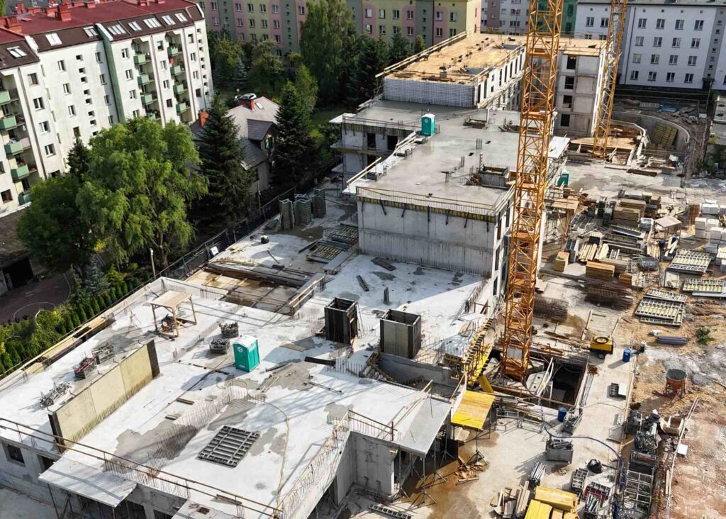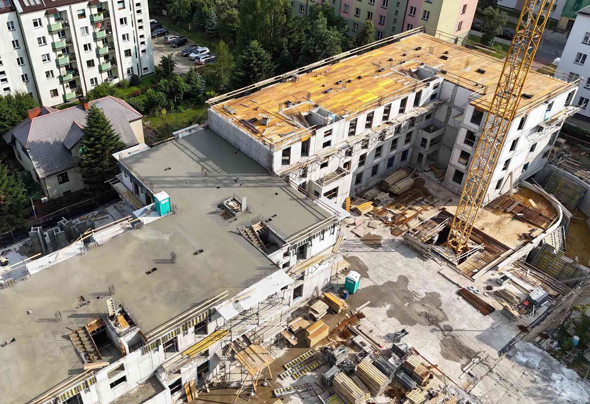 Powstają kolejne piętra Domu na Mariackiej. Obecnie budujemy 4 kondygnację od strony zachodniej, strona wschodnia szybko nadrabia zaległości. Prace idą zgodnie z planem, a tempo budowy jest imponujące.