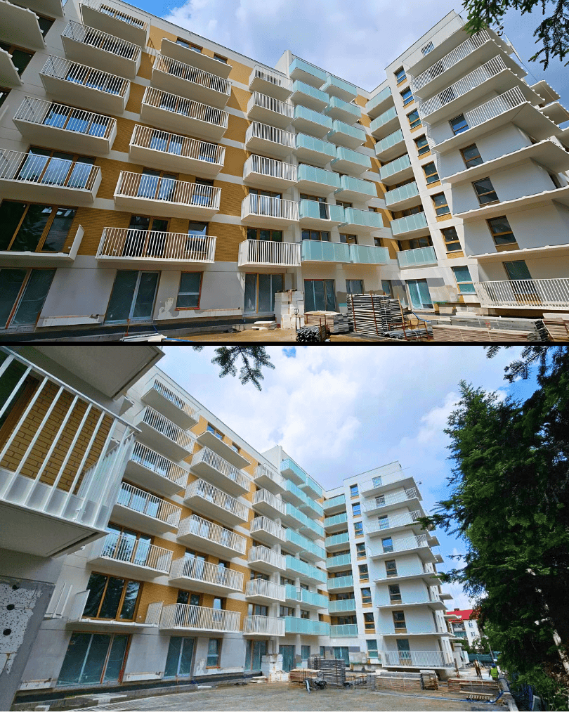 🔹 Trwają roboty elewacyjne, tynkarskie i montaż balustrad balkonowych