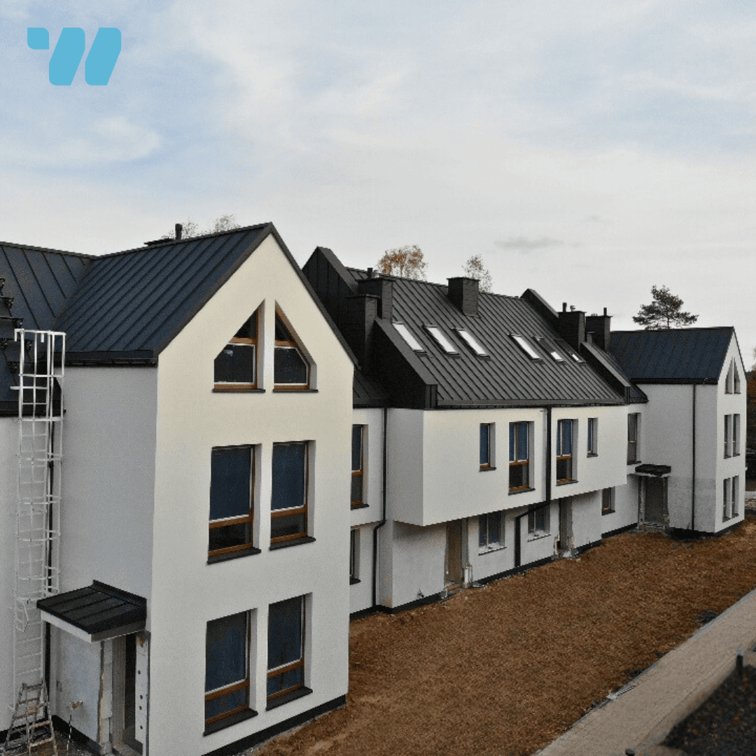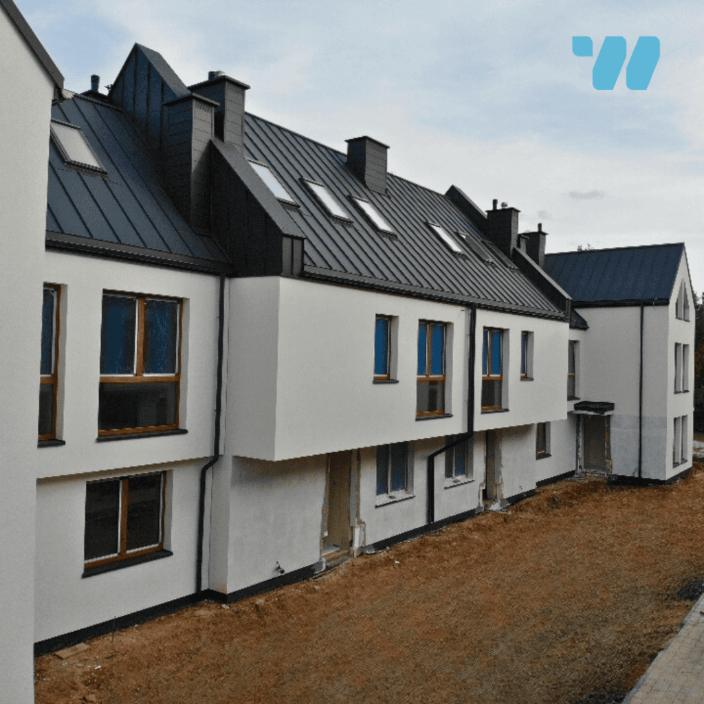Ostatni budynek A zyskał już pełną elewację i tynki. Rozpoczynamy układanie posadzek oraz zagospodarowanie terenu wokół budynku.