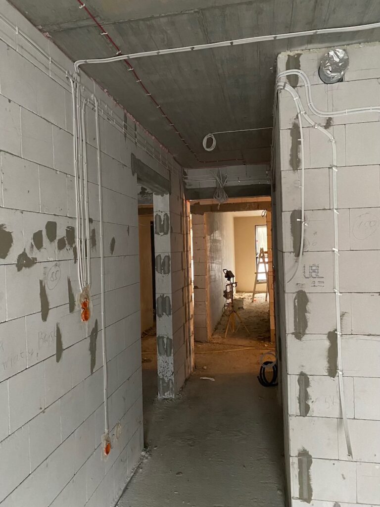 Bardzo się cieszymy, że jeszcze przed rozpoczęciem zimy osiągnęliśmy stan surowy zamknięty w Pradze Studio. To znaczy, że budynek jest już prawie gotowy od zewnątrz. Ma konstrukcję nośną, ściany zewnętrzne, dach, a także wszystkie okna i drzwi wejściowe. Teraz rozpoczynamy prace wykończeniowe. Na pierwszym i drugim piętrze trwają roboty tynkarskie – wytynkowano już 17 lokali.